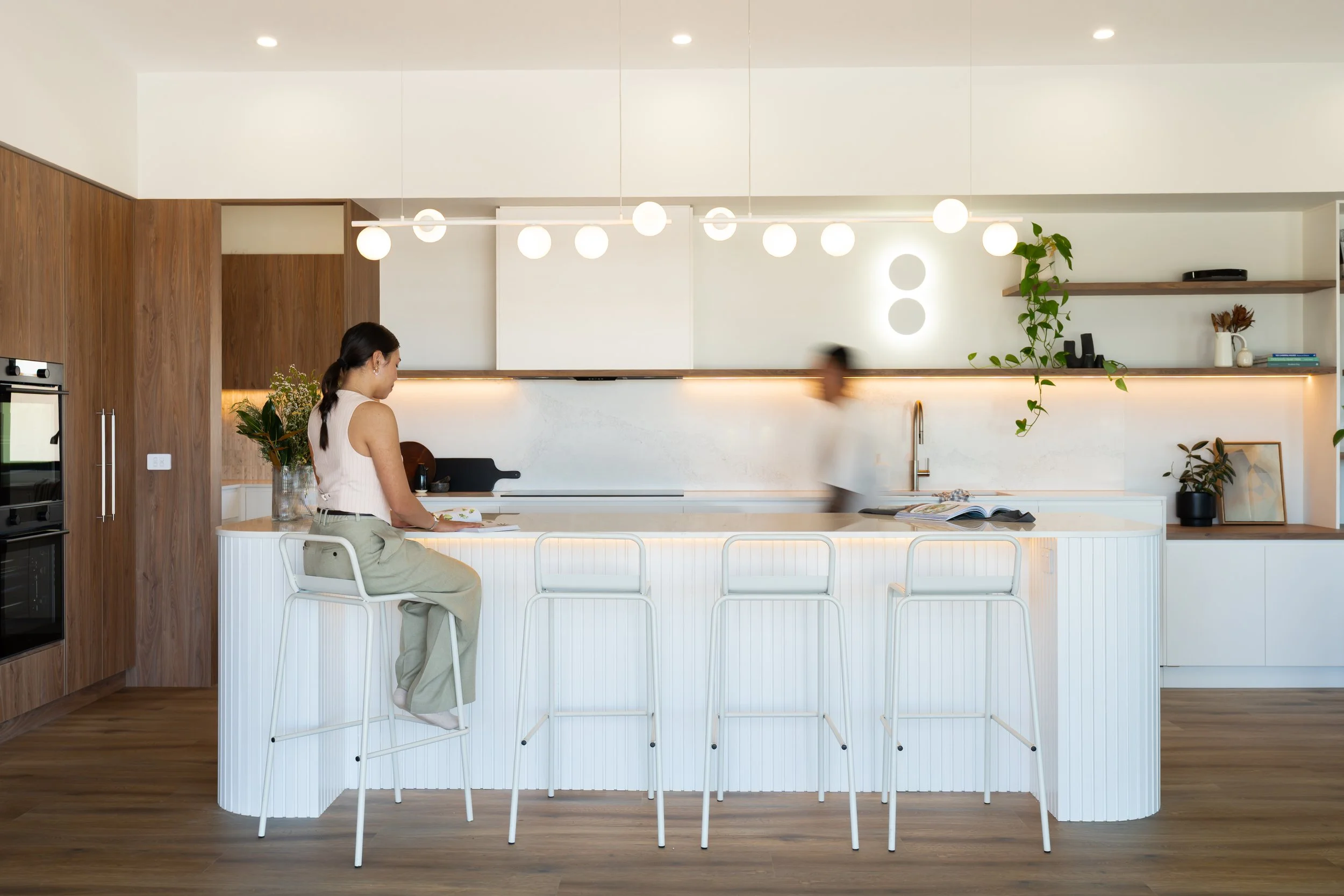 The kitchen and bookcase feature a warm mix of white surfaces and timber tones, with clever hidden nooks for the family cat. In contrast, the mudroom, laundry, and bathrooms use dark joinery tones, creating a cosy, grounded atmosphere within these larger spaces.
