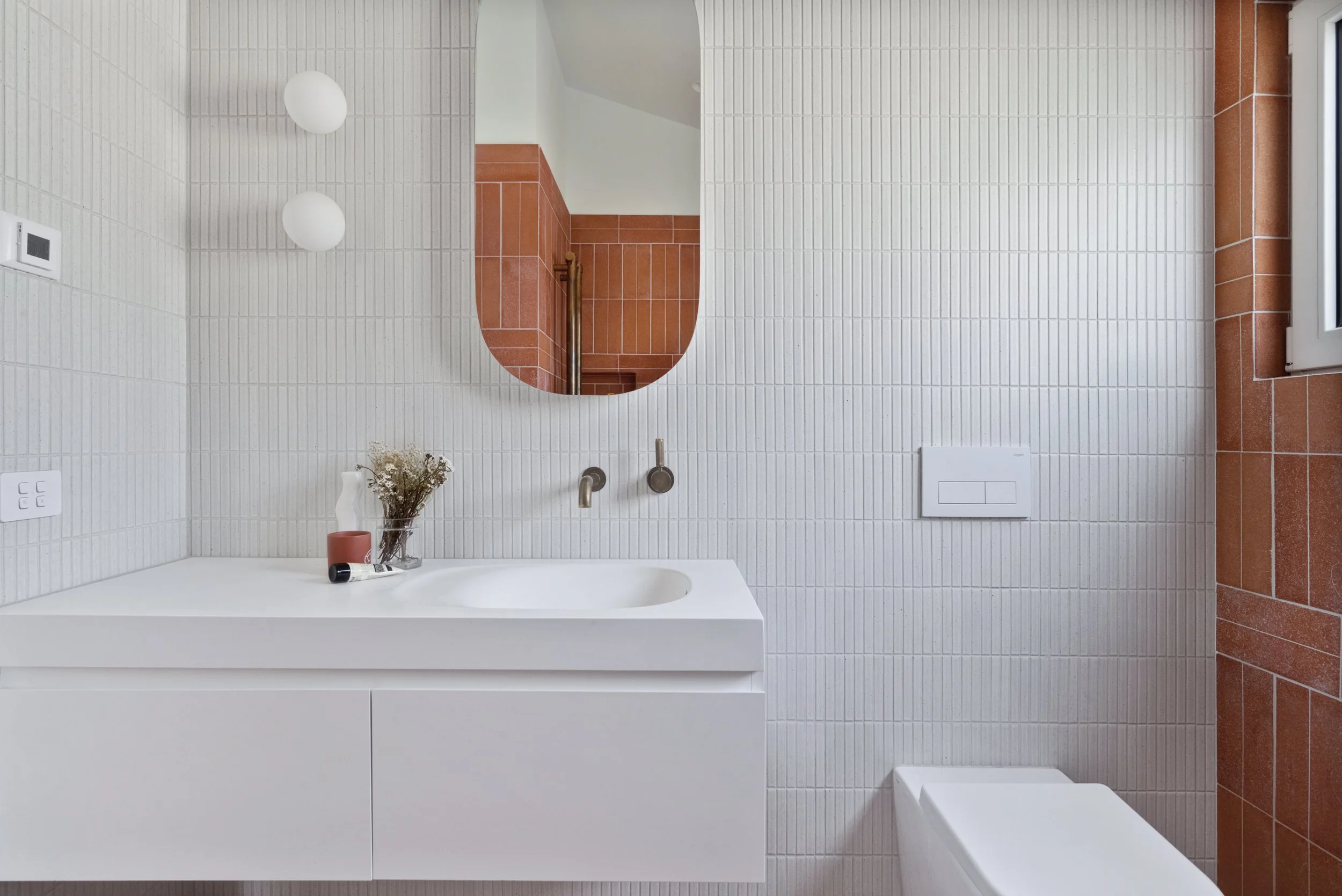 The bathroom makes a statement with daring colour choices, bold tile patterns, and tactile surfaces. Terracotta tiles with natural colour variation and organic mosaic textures add warmth and depth. Every detail is intentionally considered, balancing contemporary design with comfort, functionality, and playful moments that make this home uniquely lived in.