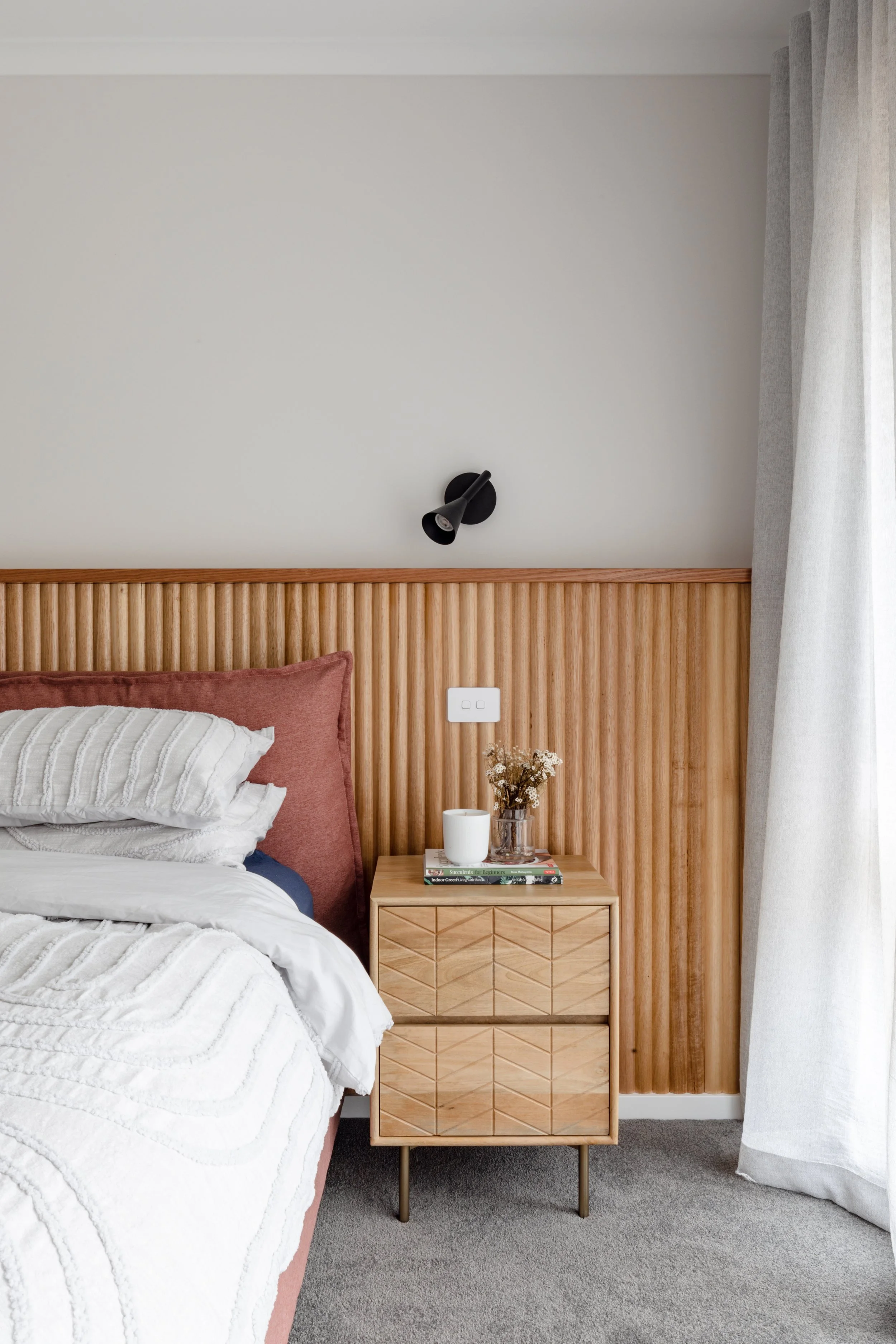 Custom timber detailing continues in the bedrooms, including a warm, inviting bedhead, while the modern ensuite combines a timber vanity with gunmetal grey tapware for a balance of elegance and contemporary style. Practicality and design meet throughout the home, from an open built-in office ideal for working from home, to a contemporary laundry with integrated hampers, built-in storage, drying, and a striking blue splashback tile.