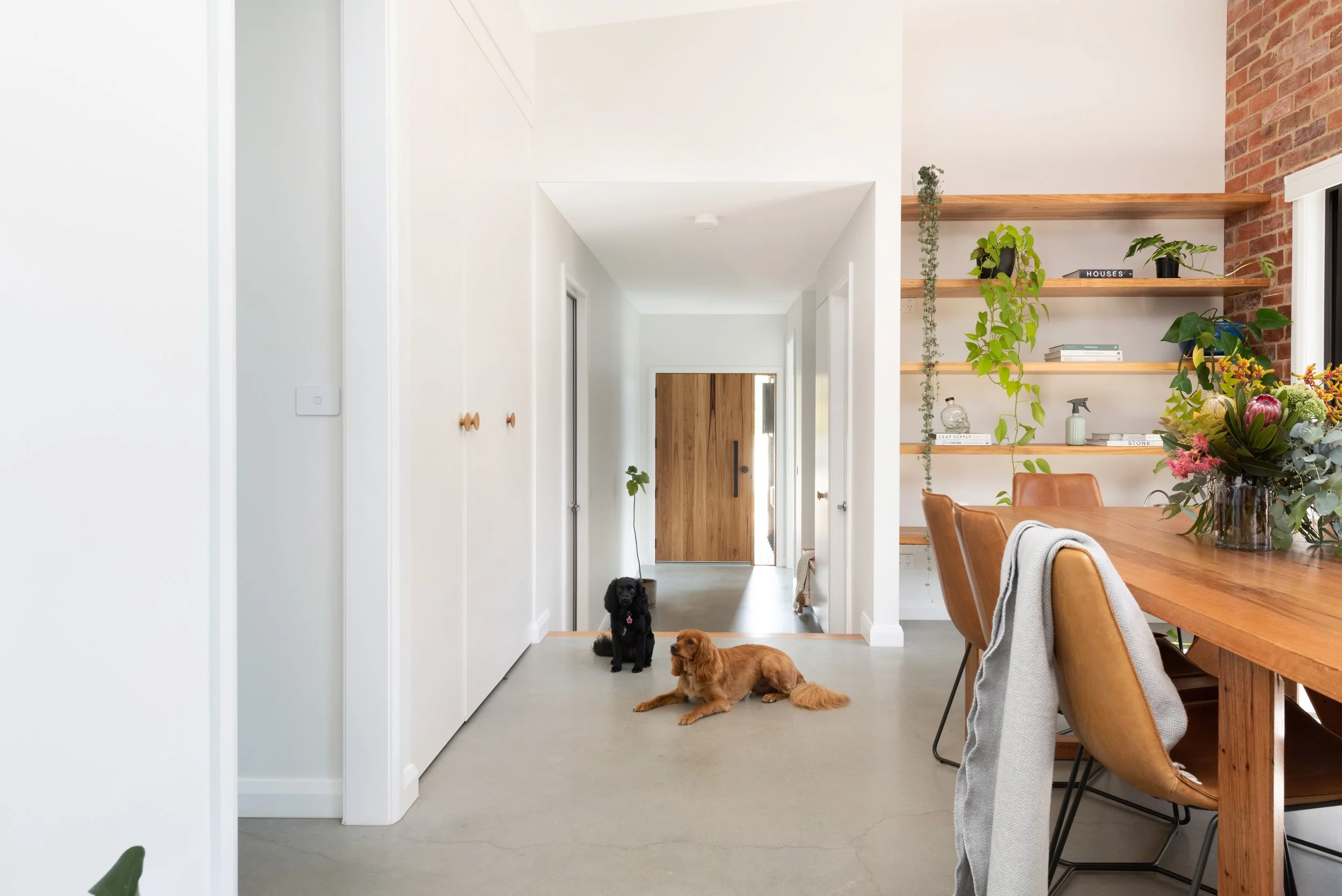 Raked ceilings enhance volume within the main living areas and northern bedrooms, drawing in winter sun and reinforcing the home’s passive performance. The concrete slab acts as both a thermal asset and a grounding design feature, anchoring the interiors with subtle strength.